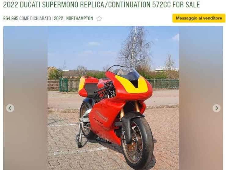 Su Car & classic, come detto, abbiamo scovato una replica in vendita. La replica/continuazione della Ducati Supermono è opera del venditore, che dichiara di aver avuto il privilegio di lavorare su oltre 20 delle 67 moto prodotte.