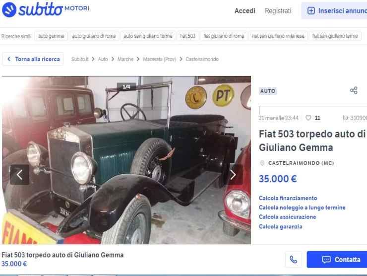 Un’auto che su Subito.it viene segnalata in ottime condizioni, con motore funzionante e gomme nuove, compresa quella di scorta. Vettura a trazione posteriore, che aumenta il proprio valore per essere stata intestata a un grande attore come Giuliano Gemma. Da rifare solo la capote, che è ancora quella originale. Ma il prezzo è un affare: 35mila euro.