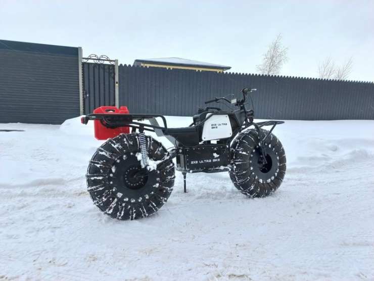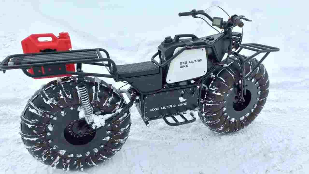 L’Ultra Bike è elettrica: ognuna delle sue ruote ha un motore DC brushless nel mozzo in grado di raggiungere un picco di 2 kW, o 1 kW sostenuto, selezionato per una coppia elevata data la sua evidente predilezione per il fuoristrada estremo su neve, fango e sabbia. La velocità massima è di 48 km/h. Letti così sembrano un po’ pochini, ma quando questa moto riesce ad “arrampicarsi” su terreni scoscesi e dissestati, allora la percezione cambia totalmente.