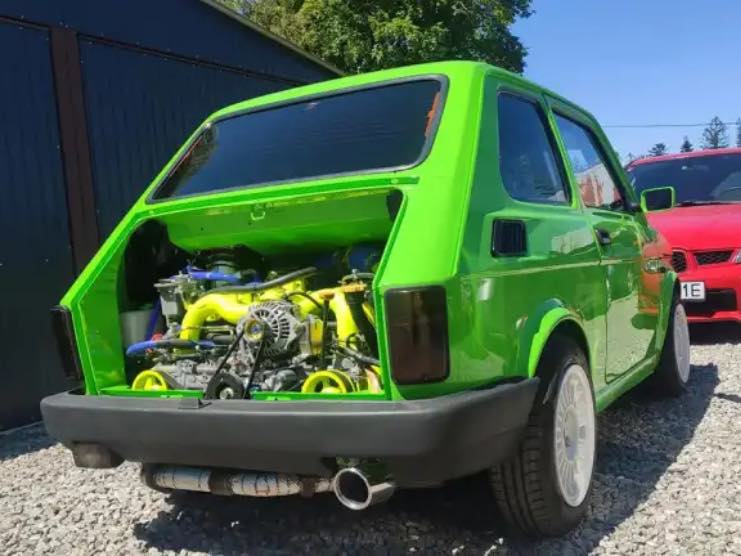 L’auto di oggi, questa Fiat 126p, è stata modificata pesantemente per raggiungere la potenza di oltre 300 cavalli anche se è difficile immaginare con precisione a che limite di cavalli arriverà in futuro quest’auto, pronta solo al 98% secondo i suoi creatori. In pratica, di fronte a noi abbiamo una vettura italiana prodotta in Polonia che monta un motore giapponese, l’EJ22 della famosissima Subaru Impreza che entra a malapena nel piccolo scomparto sul retro.