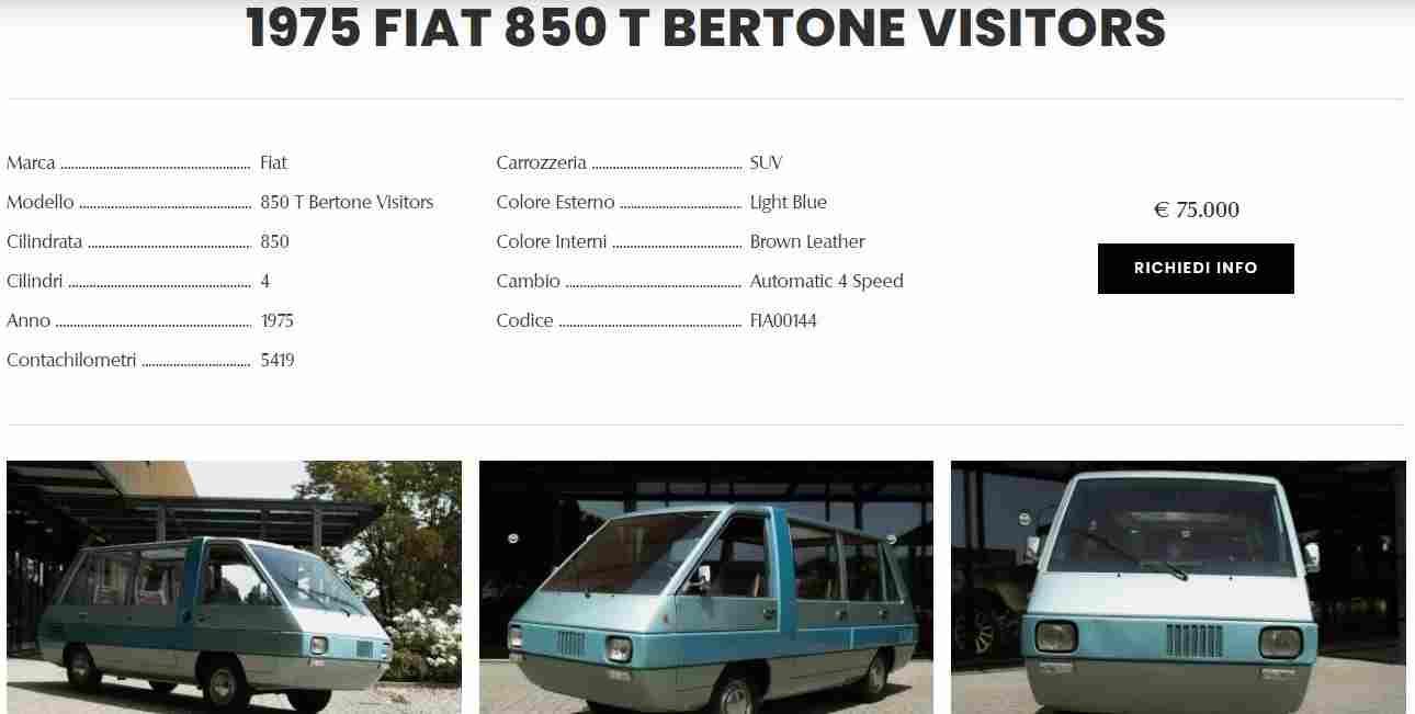 Quello in vendita è il modello che Bertone presentò nel 1975 al Salone dei Veicoli Industriali di Torino. Si trattava di un nuovo minibus basato proprio sulla meccanica della Fiat 850 T. Destinato per trasportare i visitatori nelle fabbriche Fiat, il Fiat 850 Bertone Visitors aveva dimensioni ridotte, comfort di utilizzo e superfici vetrate significative. La sicurezza era affidata a una striscia di metallo che circondava il veicolo.