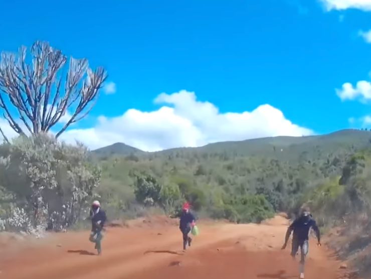 Nel video, tre banditi tendono un’imboscata con tutte le carte in regola ai due americani che sono a bordo di una Toyota Land Cruiser, fuoristrada perfetto per affrontare un terreno difficile come quello keniota. I tre uomini fingono di rapinare un furgone ma all’arrivo della jeep, si scagliano contro di essa: nelle loro mani, brillano le lame di altrettanti machete.