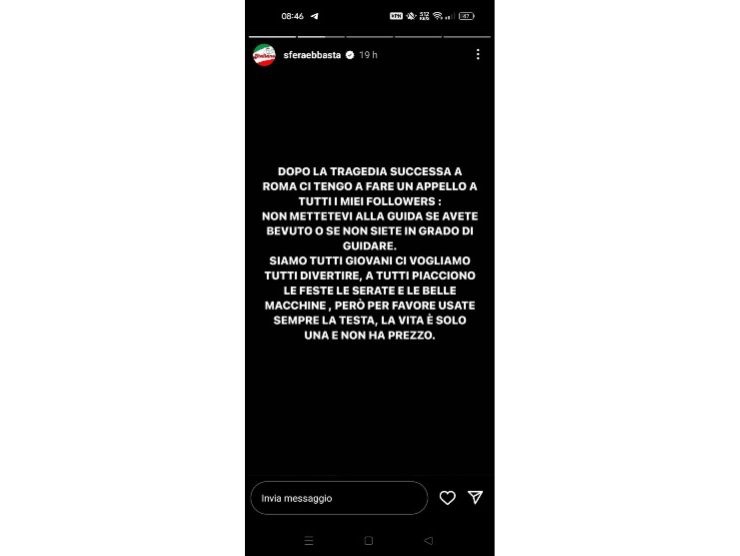 Il suo appello è stato lanciato su Instagram dove l’artista ha un seguito di ben 3,9 milioni di followers che – si spera – avranno modo di riflettere su quanto scritto dal cantante: “Voglio lanciare un appello ai miei fans: non mettetevi alla guida se avete bevuto o se non siete in condizioni”, chiede Sfera, nome d’arte di Gionata Boschetti.
