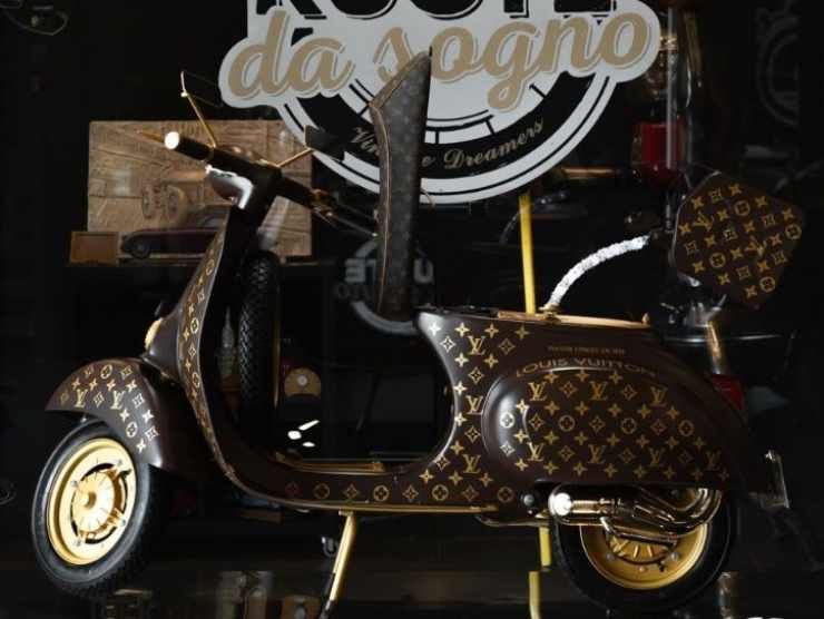 Le lettere LV sono state allineate alle forme della Vespa, la marmitta è una Gianelli originale, oro lucido. La scheda su Ruote da Sogno indica un restauro eseguito in ogni componente. La Vespa, peraltro, non è solo un esercizio di stile, essendo stata esposta anche alla Biennale di Venezia. Ma è perfettamente funzionante. Su Ruote da Sogno la troviamo in vendita a 32mila euro.