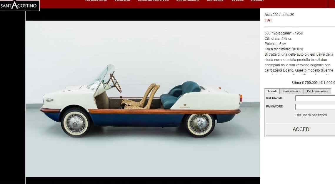 Sul portale Sant’Agostino, oggi, troviamo proprio un’auto che rientra in questa tipologia. Una 500 “spiaggina”, prodotta in soli due esemplari nella sua versione originale con carrozzeria Boano. Questo modello divenne popolarissimo negli anni Sessanta perché ritratto costantemente sui rotocalchi di tutto il mondo assieme ai suoi proprietari dalla fama incontrastata: parliamo di Gianni Agnelli, appunto, e dell’armatore Aristotele Onassis. Uno dei due esemplari (quello appartenuto a Onassis) è andato distrutto in un incidente. L’altro esemplare, unico al mondo, si trova ancora a Torino, ed è quello in vendita.