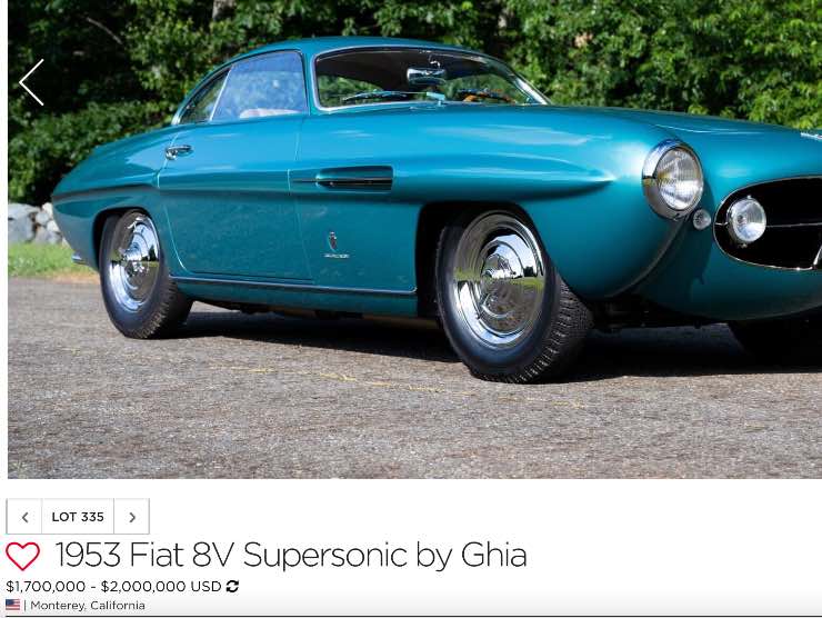 Come avrete capito insomma, la Fiat 8V Supersonic è un’auto unica, piena di storia e soprattutto mozzafiato. Un vero capolavoro di ingegneria…con un prezzo che rispecchia le sue ottime qualità. Secondo i battitori di RM Sotheby che la manderanno molto presto all’asta, l’auto non andrà via a meno di 1.700.000 – 2.000.000 Dollari complessivi. Quante volte avete visto un prezzo a sei zeri vicino ad una Fiat? Per noi, è la prima volta.