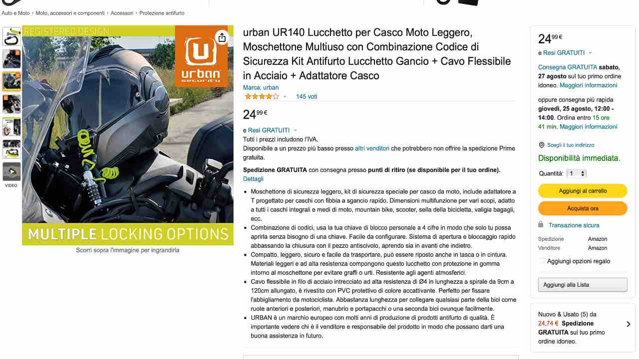 Si chiama Urban UR 140 ed è utile per i caschi da moto di tipo leggero. Il pezzo è fornito di un moschettone multiuso, dotato di combinazione. Quindi, viene offerto un Kit antifurto, con lucchetto e gancio, più un cavo flessibile in acciaio.