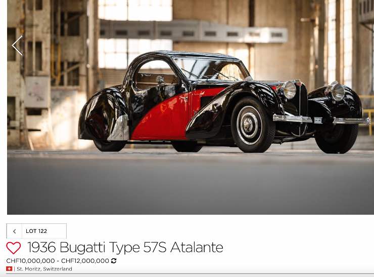 La Type 57S Atlante che andrà in vendita a St. Moritz – ma guarda un po’ – il 9 settembre potrebbe battere anche questo record: l’automobile infatti è stata valutata 12 milioni di Franchi svizzeri, un cartellino del prezzo stellare. Non sorprende: parliamo di una vettura storica in condizioni eccellenti, praticamente unica in questa configurazione e con oltre ottant’anni di età.