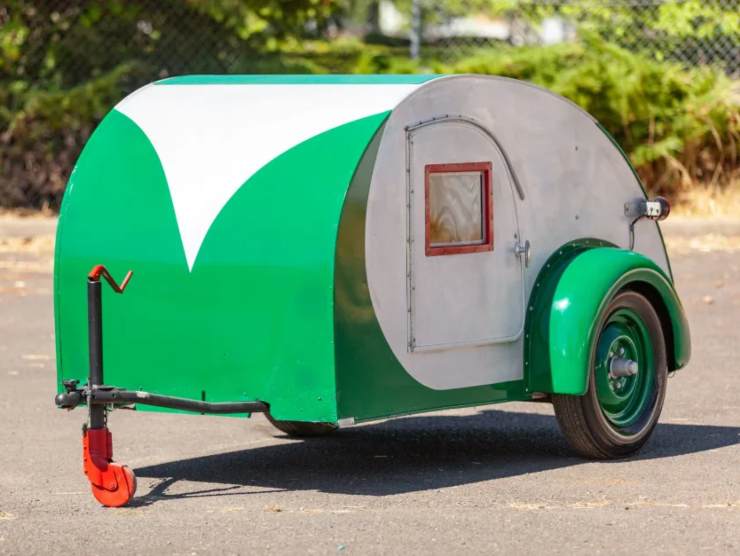Normali dettagli che con il tempo possono deteriorarsi. Ma per il resto, questo kit è davvero ottimo. Un rimorchio da viaggio rifinito in verde e bianco che presenta – oltre a quanto già citato – un angolo cottura, un martinetto a linguetta a ruota singola e una superficie interna. Un rivenditore lo ha acquistato l’anno scorso.