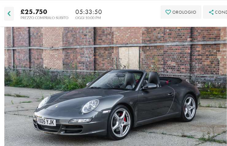Al momento l’auto è prossima a vedere concludere l’asta sul sito britannico e la si può dunque portare a casa per un prezzo per ora molto basso: 25.750 Euro. Un’occasione dunque da cogliere al volo, con gli appassionati che sognano così un acquisto di prestigio come questa 911 Carrera Cabriolet.
