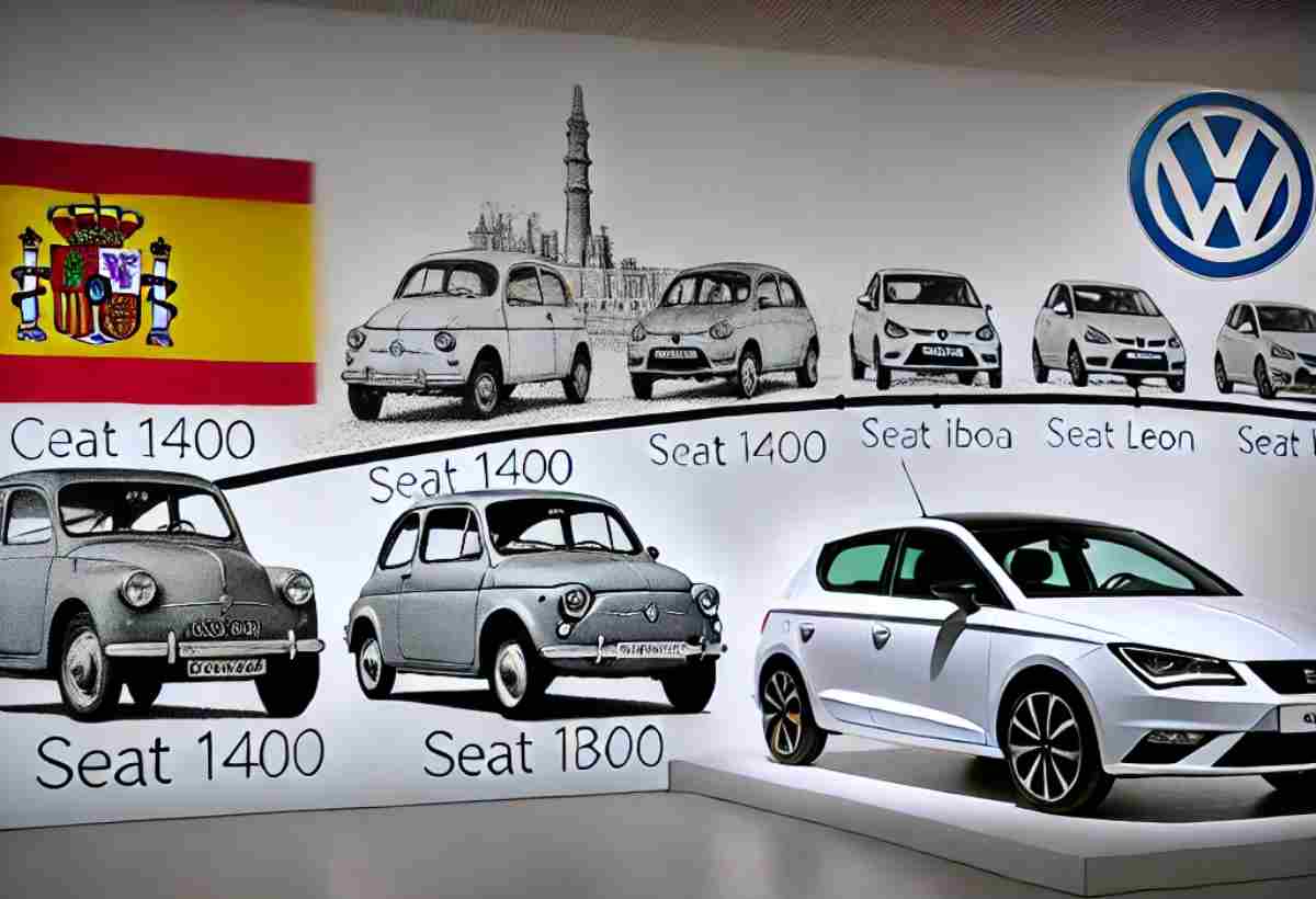 l’evoluzione storica dei veicoli SEAT, partendo dal classico SEAT 1400 fino ai modelli moderni come la SEAT Ibiza e Leon, con un accenno alla transizione sotto l’influenza Volkswagen. Puoi vedere l’immagine qui sopra.