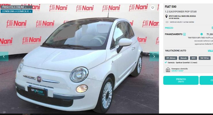 Il concessionario Spoticar F.lli Nani Srl ha messo in vendita a Massa un esemplare di 500 con motore 1.2 EasyPower Pop Star. Il prezzo è di soli 5.900 € (iva inclusa) con finanziamento diventano 71 Euro (TAN fisso 9,50% TAEG 14,67%).