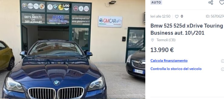 Aumentano sempre di più le offerte per quanto riguarda le auto usate che si possono acquistare su subito.it e una delle più belle occasioni si può ammirare con la BMW Serie 5 che è venduta dalla concessionaria “GM CAR” di Termoli, in provincia di Campobasso. La sede molisana infatti dà modo di mettere le mani su un modello immatricolato nell’ottobre del 2015.