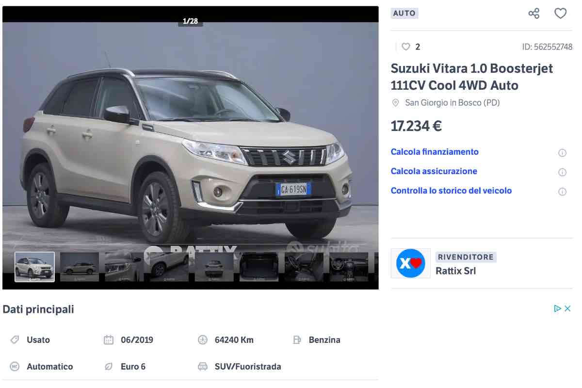 L’offerta che abbiamo davanti che, nemmeno a dirlo, arriva dal famoso portale per la vendita di auto usate Subito.it permette di portarsi a casa proprio la generazione più moderna della Vitara: il modello in questione è stato infatti immatricolato nell’estate del 2019 – quindi ha pochi anni e pochi chilometri con 64.240 percorsi in tutto – ed è dotato di motore a benzina omologato Euro 6 ed una dotazione di optional che include cambio automatico e l’immancabile trazione integrale.