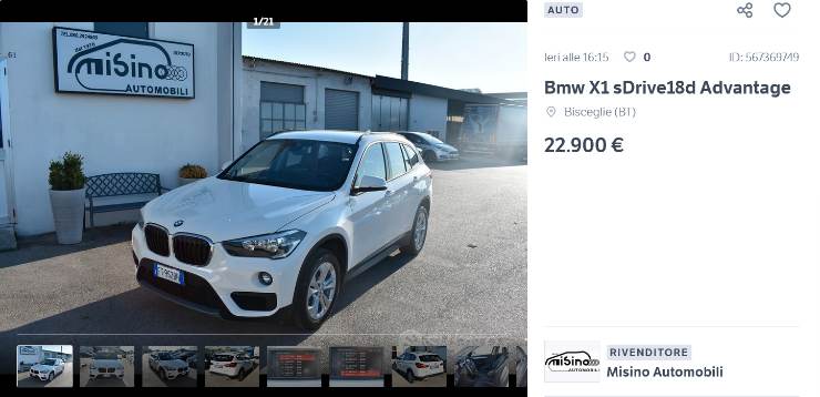 I prezzi delle auto nuove di zecca hanno subito picchi, sul fronte dei rincari, anche del 15-20% nel corso degli ultimi anni, ma per fortuna, una valida alternativa è offerta sul fronte dell’usato. Sul sito web “Subito.it“, uno dei portali più utilizzati sotto questo punto di vista, abbiamo scovato una splendida BMW X1 al prezzo di appena 22.900 euro, attualmente locata presso Bisceglie, in Puglia, nella provincia di Andria-Barletta-Trani. Ad occuparsi della vendita troviamo un concessionario e non un privato, ovvero Misini Automobili, rassicurazione importante per chi teme brutte sorprese.