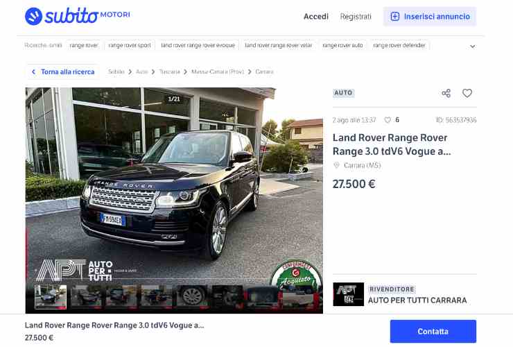 Oggi la Range Rover si può trovare in vendita a prezzo stracciato sul mercato dell’usato, proprio come quella presente sul sito di Subito.it. A metterla in commercio è stato il concessionario Auto per tutti di Carrara, il quale offre un unico esemplare immatricolato nel 2016 e con 251 mila km di percorrenza a un prezzo davvero da urlo.