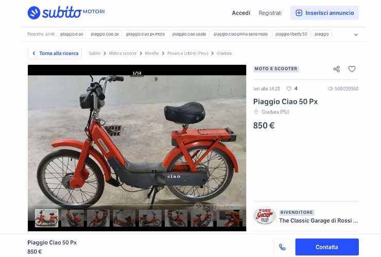 Si può trovare un modello di questo tipo e a tale prezzo, prodotto nella versione 50 PX dal 1979 al 1996, sul sito di Subito.it. Il Ciao che vi proponiamo oggi è stato immatricolato nel 1980, ha una cilindrata da 50 cc e ha percorso 500 Km. L’inserzionista è il rivenditore di moto usate e d’epoca The Classic Garage di Gradara (PU).