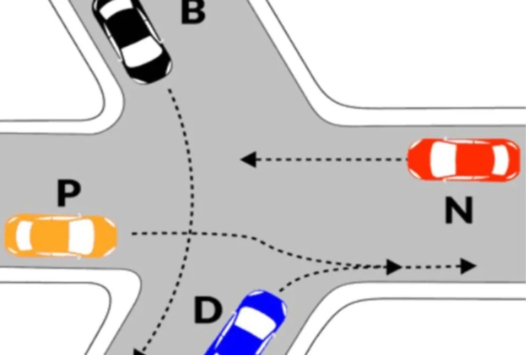 La D deve svoltare subito sulla propria destra e si porterà nel senso opposto rispetto all’auto N. Ora la soluzione è facile. Dopo lo scatto della vettura D sarà il turno dell’auto gialla con la lettere P per immettersi nella stessa direzione della D, avendo ora la destra libera. In seguito l’auto nera B avanzerà e, infine, toccherà all’ultima rimasta, con la N che vedrà passare accanto a sé D e P, scorgendo il passaggio della B, per poi poter avanzare dritta sulla propria strada. Quindi non passa per prima la N come molti, erroneamente, credono.