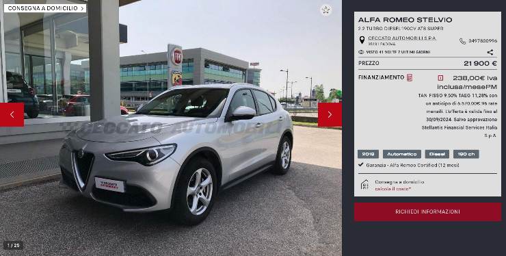Al giorno d’oggi, l’Alfa Romeo Stelvio ottiene ancora buoni risultati sul fronte delle vendite, e la rivoluzione sta per essere servita. Nel 2025 arriverà la nuova generazione di questo modello, che verrà prodotta a Cassino, sulla piattaforma STLA Large del gruppo Stellantis. Sulla carta, sarebbe dovuto essere un modello full electric, ma i vertici stanno riflettendo sul possibile inserimento di una versione termica a benzina, dal momento che la piattaforma lo permette. Nel frattempo, andiamo a scoprire una Stelvio che è in vendita ad un prezzo mai visto prima.