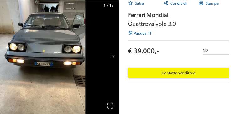 Ancora oggi, la Ferrari Mondial è la meno assoluta sul mercato dell’usato, con quella che potete vedere nell’immagine che è in vendita a solo 39.000 euro, sul sito web “Autoscout24“. Il modello in questione fu immatricolato nel giugno del 1982 ed ha percorso solamente 68.000 km, e potrebbe sempre essere un ottimo investimento per gli appassionati. Il prezzo è sicuramente ottimo per l’acquisto di un’auto del Cavallino.