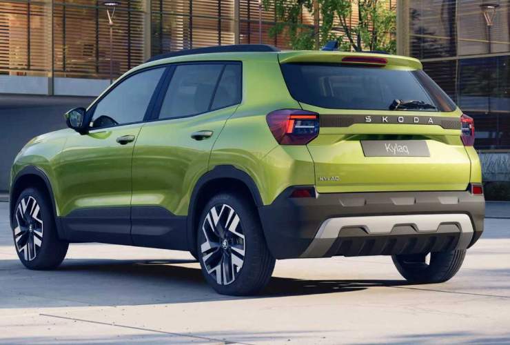 I gruppi ottici a LED, divisi in due parti, fiancheggiano la griglia nera, mentre la forma dei fanali posteriori ricorda la Hyundai Exter. I designer Skoda hanno aggiunto alcune caratteristiche dei SUV, tra cui i rivestimenti in plastica, le piastre di protezione in stile alluminio, barre sul tetto, passaruota squadrati e 189 mm (7,4 pollici) di altezza da terra. La Kylaq sarà disponibile in cinque tonalità esterne, tra cui la nuova Olive Gold raffigurata. L’abitacolo è spazioso con una capacità di carico leader nel segmento di 446 lt.
