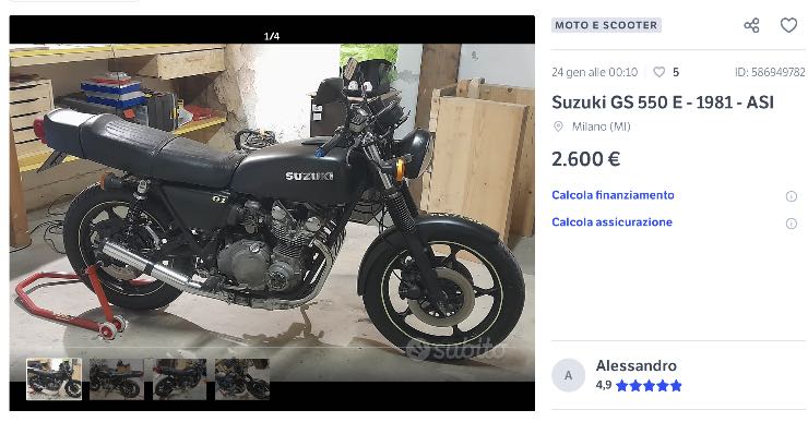 Così come nelle auto, anche nelle moto esistono dei veri e propri amanti dei modelli d’epoca, che farebbero carte false per entrare in possesso di uno di questi gioielli d’altri tempi. Ebbene, questo potrebbe essere il vostro giorno fortunato, vista l’offerta di cui vogliamo andare a parlarvi. Sul sito web “Subito.it“, troviamo una Suzuki GS 550 E in vendita a soli 2.600 euro, e che è attualmente locata presso Milano. Essa è iscritta all’ASI ed il venditore, di nome Alessandro, ed è perfettamente funzionante, con gomme quasi del tutto nuove, ed ottime condizioni generali.