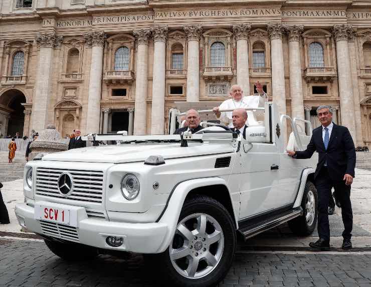 Partiamo dalla fine, dalla vettura che vediamo qui in questo scatto. Papa Francesco si spostava di recente sulla Mercedes Classe G elettrica convertita a papamobile, modificata appositamente per facilitare l’accesso del pontefice al veicolo, visto il suo stato di salute molto precario. La vettura è stata consegnata personalmente da Ola Kallenius, che l’ha voluta donare al Vaticano. Oltre alla Classe G ad emissioni zero, c’è stata anche un’altra auto ad emissioni ridotte, ovvero la Toyota Mirai, vale a dire la vettura ad idrogeno della casa giapponese, l’auto più venduta al mondo tra quelle a celle a combustibile.