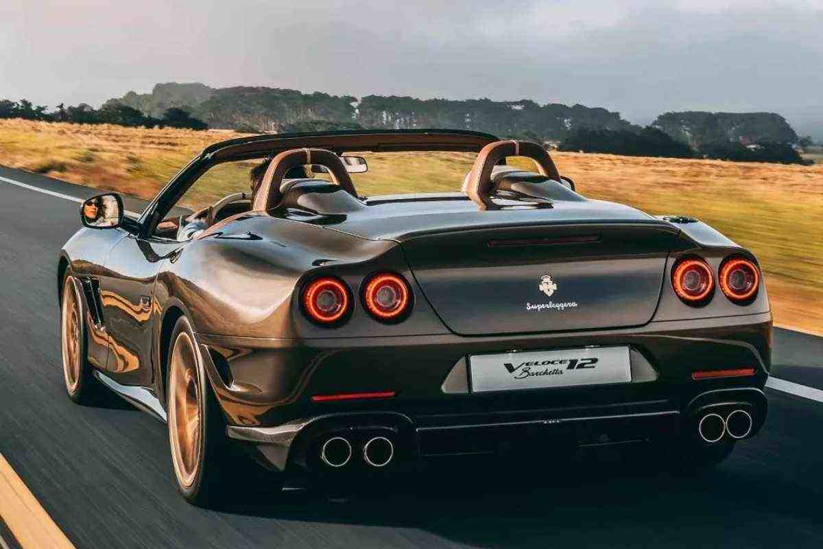 Per l’occasione i tecnici hanno inserito due roll-bar rivestiti in pelle dietro i sedili. Inoltre, i tuner di Touring Superleggera hanno creato un rivestimento posteriore specifico per la Veloce12. Infine, come la versione con tetto fisso, la Barchetta sfoggia nuovi terminali di scarico e un diffusore in fibra di carbonio. Sotto al cofano c’è il mitico V12 aspirato da 5,5 litri che sprigiona 478 CV e 419 lb-ft (568 Nm), proprio come nella 550 originale. L’auto del Cavallino vantava un cx di 0,33, ottenuto dopo 4800 ore di lavoro in galleria del vento. Sul cofano era presente una hood scoop. L’angolo tra le bancate era di 65°, la potenza massima era di 485 cavalli a 7000 giri/minuto, mentre la coppia massima equivaleva a 569 N m (58 kgm) a 5000 giri/minuto, disponibile dai 3000 giri/minuto in poi.