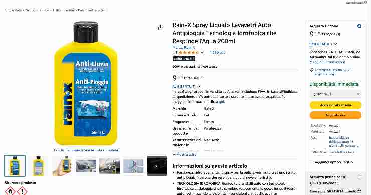 Per fortuna, la tecnologia sta facendo dei passi da gigante, e stanno arrivando tanti prodotti utili ed economici per risolvere i nostri problemi. Un esempio è l’Anti Pioggia Idrofobico Rain-X, che è disponibile in vendita su “Amazon” ad un prezzo davvero irrisorio. La tecnologia idrofobica è la sua grande caratteristica principale, dal momento che vi basterà stenderlo sul parabrezza seguendo i passaggi, ed il prodotto, in pochi minuti, lascerà una pellicola trasparente che eviterà di oscurare la visibilità in caso di pioggia.